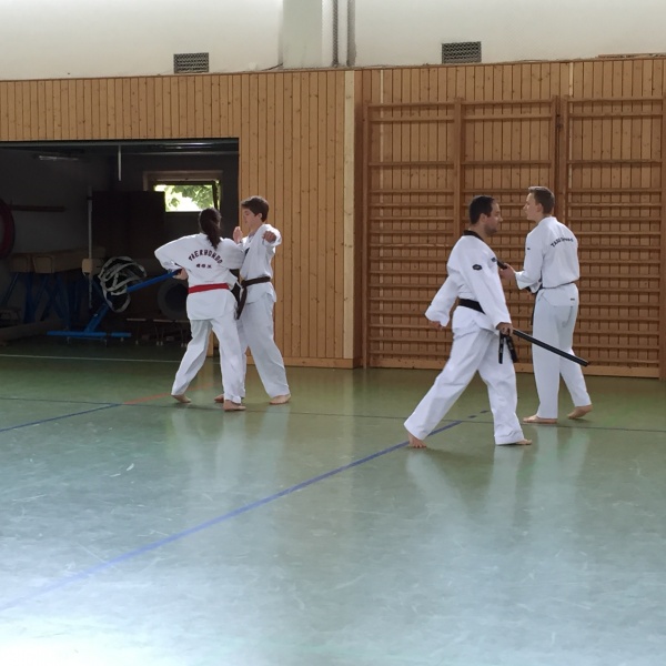 Am 29.05.2016 veranstaltete die Taekwondo Union Sachsen in unserer Sporthalle den DAN-Vorbereitungslehrgang. Unter der Leitung des Prüfungsreferenten Ralf Uhlich waren insgesamt 14 Sportler aus verschiedenen Vereinen vor Ort. Aus unserem Verein nahmen 4 Sportler daran teil. Die Möglichkeit mit zu trainieren haben unsere Sportler Vanessa, Asis, Andre` und Claudia Leuthäuser wahrgenommen. Dank gilt auch unserem Hermann, der die Versorgung der Teilnehmer organisierte. Insgesamt war dies eine gelungene Veranstaltung. | |